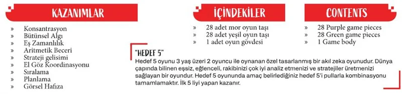 Hedef 5 oyunu 3 yaş üzeri 2 oyuncu ile oynanan özel tasarlanmış bir akıl zeka oyunudur. Dünya çapında bilinen eşsiz, eğlenceli, rakibinizi çok iyi analiz etmenizi ve stratejiler üretmenizi sağlayan bir oyundur. Hedef 5 oyununda amaç belirlediğiniz Hedef 5’i pullarla kombinasyonu tamamlamaktır. İlk 5’liyi yapan kazanır.