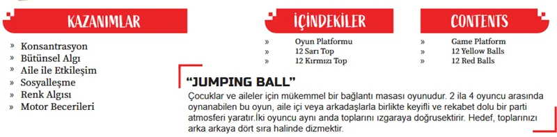 Çocuklar ve aileler için mükemmel bir bağlantı masası oyunudur. 2 ila 4 oyuncu arasında oynanabilen bu oyun, aile içi veya arkadaşlarla birlikte keyifli ve rekabet dolu bir parti atmosferi yaratır. İki oyuncu aynı anda toplarını ızgaraya doğru sektirir. Hedef, toplarınızı arka arkaya dört sıra halinde dizmektir.